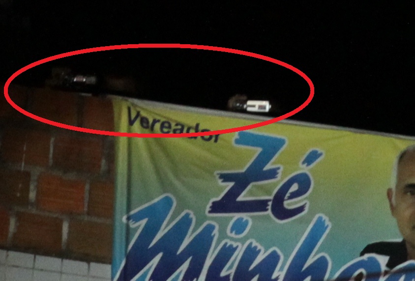 Durante o comício desta quinta-feira (04), o locutor do evento Adielson Galvão, percebeu que estava sendo monitorado por um cinegrafista escondido na laje de um prédio que tinha faixa e bandeira da coligação adversária.